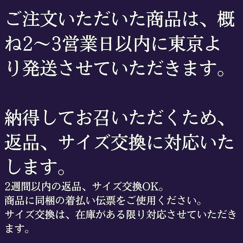 ※2週間以内のサイズ交換OK。ご購入時、商品に同梱の着払い伝票に交換希望サイズを明記の上、ご使用ください。在庫がある限り、対応させていただきます。