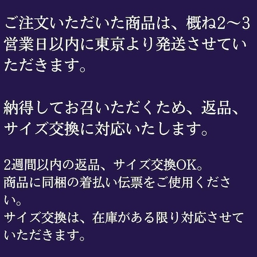 納得してお召しいただくため、商品到着後2週間以内の返品、サイズ交換に対応いたします。